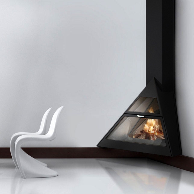Угловой камин со стеклянной дверцей, с верхним подключением.