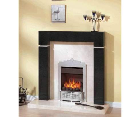 Этот камин, изготовленный из натурального камня черного и белого цвета, сочетает в себе простую форму и оригинальный дизайн. Контраст между колоннами и светлой частью фасада делает эту модель эффектной и запоминающейся.