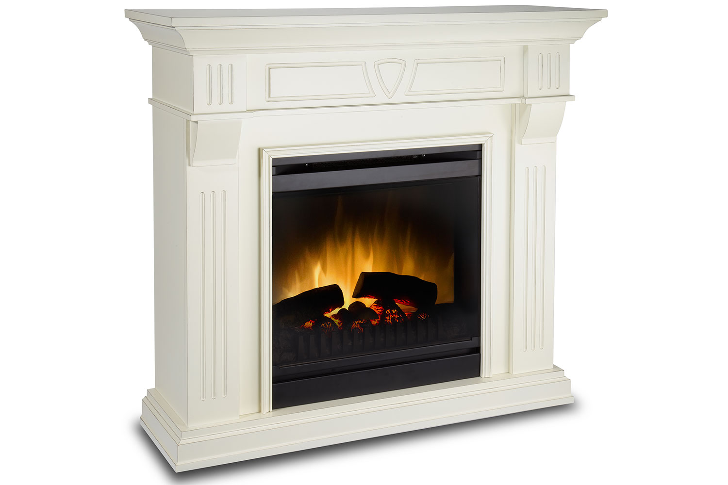 Стильное современное обрамление выполнено в четких прямых линиях, колонны и фронтальная часть портала украшены стильной резьбой. Каминокомплект представлен в единственном цвете «слоновая кость с патиной». Черный широкий очаг с эффектом пламени Optiflame станет ярким акцентом каминокомплекта, а яркое пламя притянет взгляд из любой точки помещения.